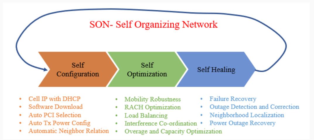 SON can be divided into three working mechanisms as These mechanism enables the Cellular Network to automatically process, configure, and repair networks.